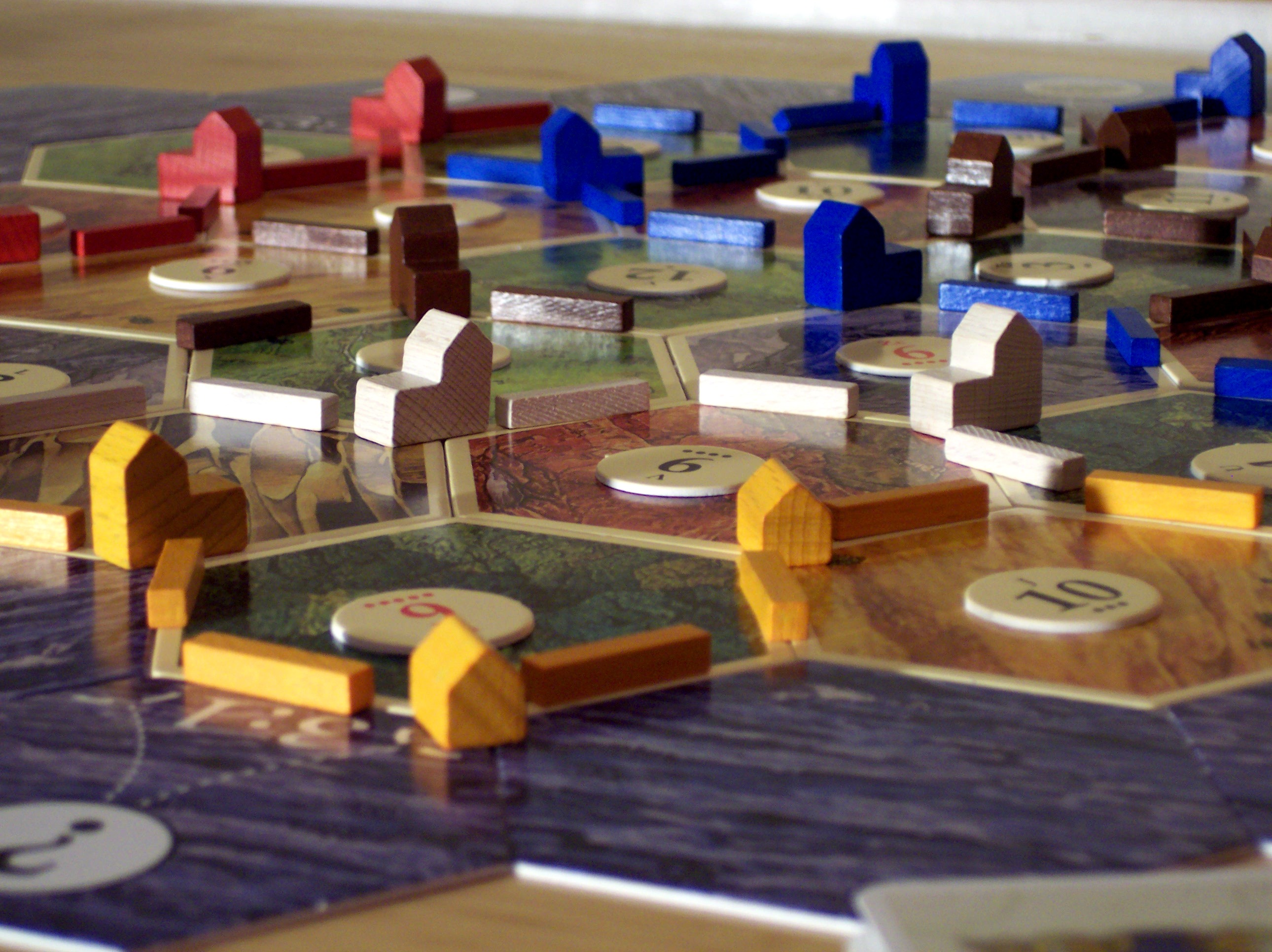The Settlers of Catan: Players create villages on a hexagonally tiled land and try to gather as many resources as possible to grow their empire. This one has the biggest luck factor of all but this can be minimised through careful play.
