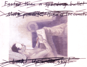 The story progresses through various aspects of Superman’s identity. It opens with a bittersweet story about a young boy who wears a Superman costume to school and feels like a hero, for just one day. A comparison is then made between Clark Kent who can duck out of the Daily Planet and be a hero on his lunch back while the others remain in the office and languish for another hour.