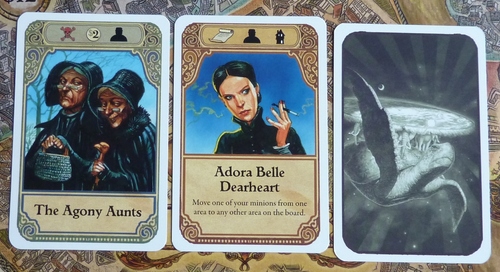 This is an area-control game. The game board is a (wonderfully drawn) map of Ankh-Morpork, divided into twelve areas, such as Nap Hill, Unreal Estate and The Shades. Players have a hand of cards based on Discworld which allow you to perform various actions which can include spreading their minions across the city, constructing buildings in different areas or even performing the noble art of assassination. Sergeant Colon, for  example, lets you remove trouble from an area and place a minion, whereas Death lets you perform two assassinations and then place a building.